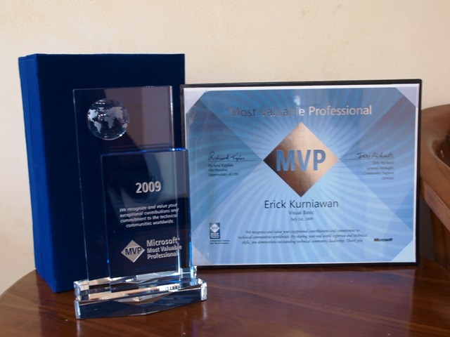 Pada bulan July 2009 saya mendapatkan kado istimewa berupa award Microsoft MVP (Most Valuable Professional) untuk bidang keahlian Visual Basic (https://mvp.support.microsoft.com/profile/erick).