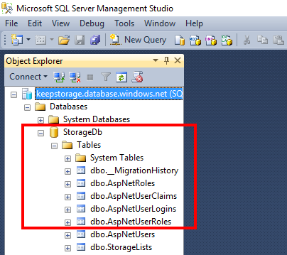 Maka anda akan dapat melihat database StorageDb yang ada di SQL Azure.
